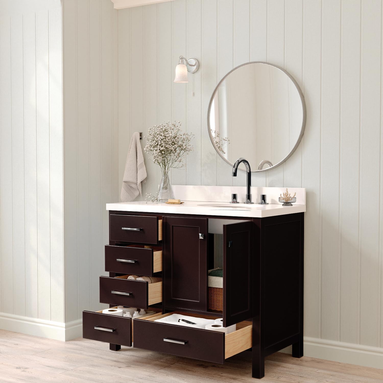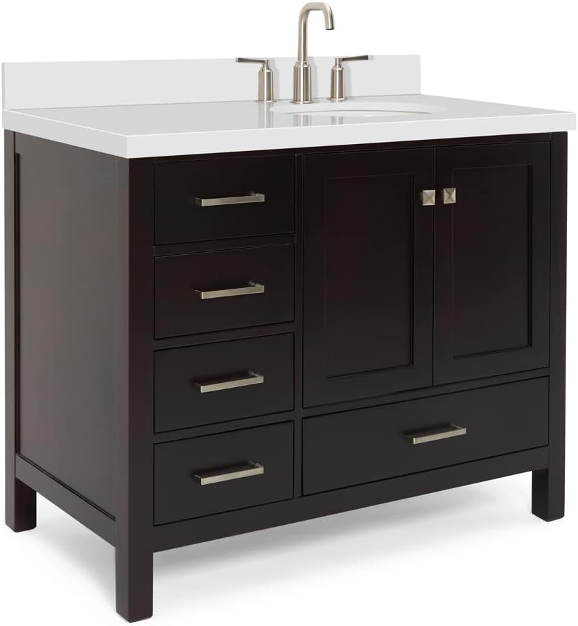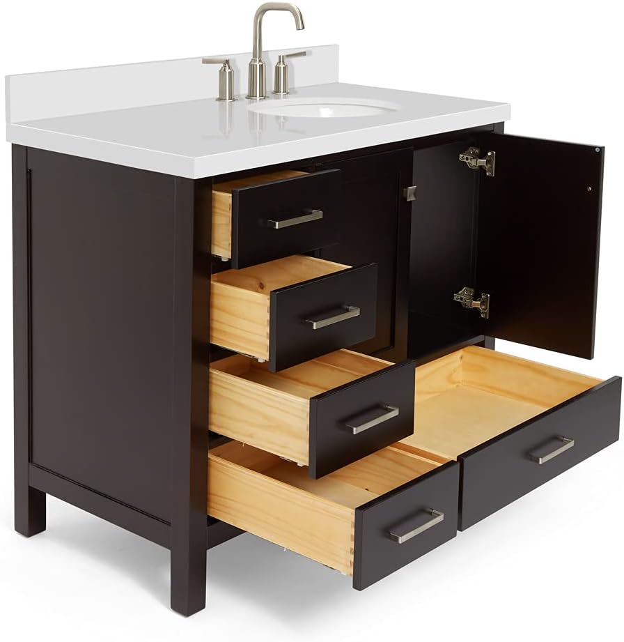 | Included Components | solid wood base cabinet, polished predrilled double-sealed countertop, oval porcelain undermount sink, 4-inch backsplash, brushed nickel hardware, adjustable soft-close drawer glides, hinges |