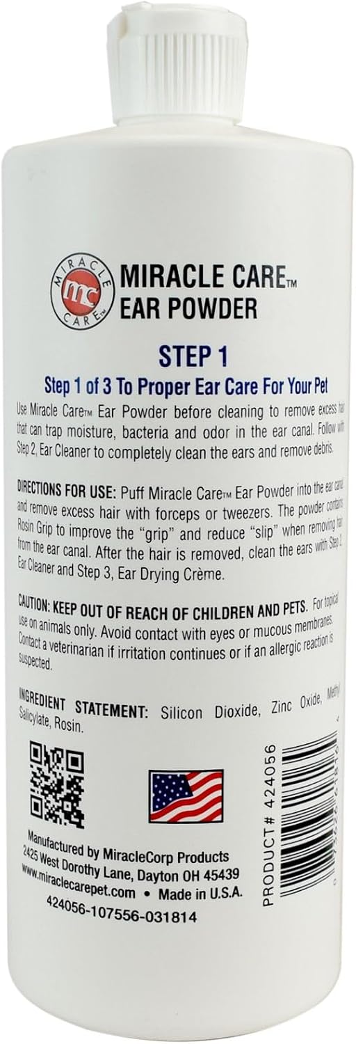 Introducing Miracle Care Powder for dogs ear hair plucking, your pet's first step to optimal ear health in the revolutionary R-7 Three Step Ear Care Program. This cat & dog ear powder is designed to be the initial defense against ear issues in your furry friend. Miracle Care R-7 Ear Powder facilitates a thorough cleaning process, ensuring the removal of excess moisture and preventing the onset of potential infections. Regular use promotes a dry and hygienic environment in your pet's ears Say goodbye to unpleasant odors and pesky wax buildup with Miracle Care R-7 Ear Powder. Ensuring a fresh and comfortable experience for your pet, minimizing discomfort and reducing the risk of hearing issues associated with wax accumulation.